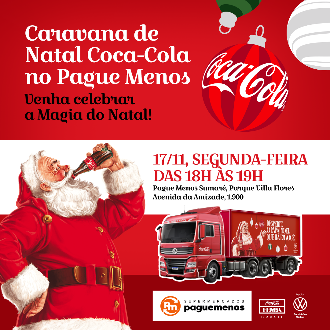 “É com grande alegria que mais uma vez recebemos a Caravana de Natal da Coca-Cola, agora em Sumaré. O Natal é um período especial, que desperta memórias afetivas e aproxima as pessoas. Poder proporcionar este momento aos nossos Clientes é extremamente gratificante. Parcerias como essa reforçam nosso compromisso com a cultura e o lazer, levando experiências marcantes à população”, afirma Fabio Cecon, gerente de Marketing e Comunicação da Rede de Supermercados Pague Menos.
